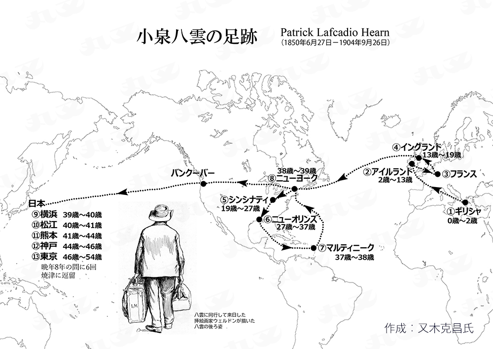 ご覧の海の写真とイラスト「小泉八雲の足跡」は、八雲研究家の又木克昌氏にお願いして拝借したものです。ギリシャで誕生してから日本に渡るまでの生涯の足跡をわかりやすく説明されておられます。