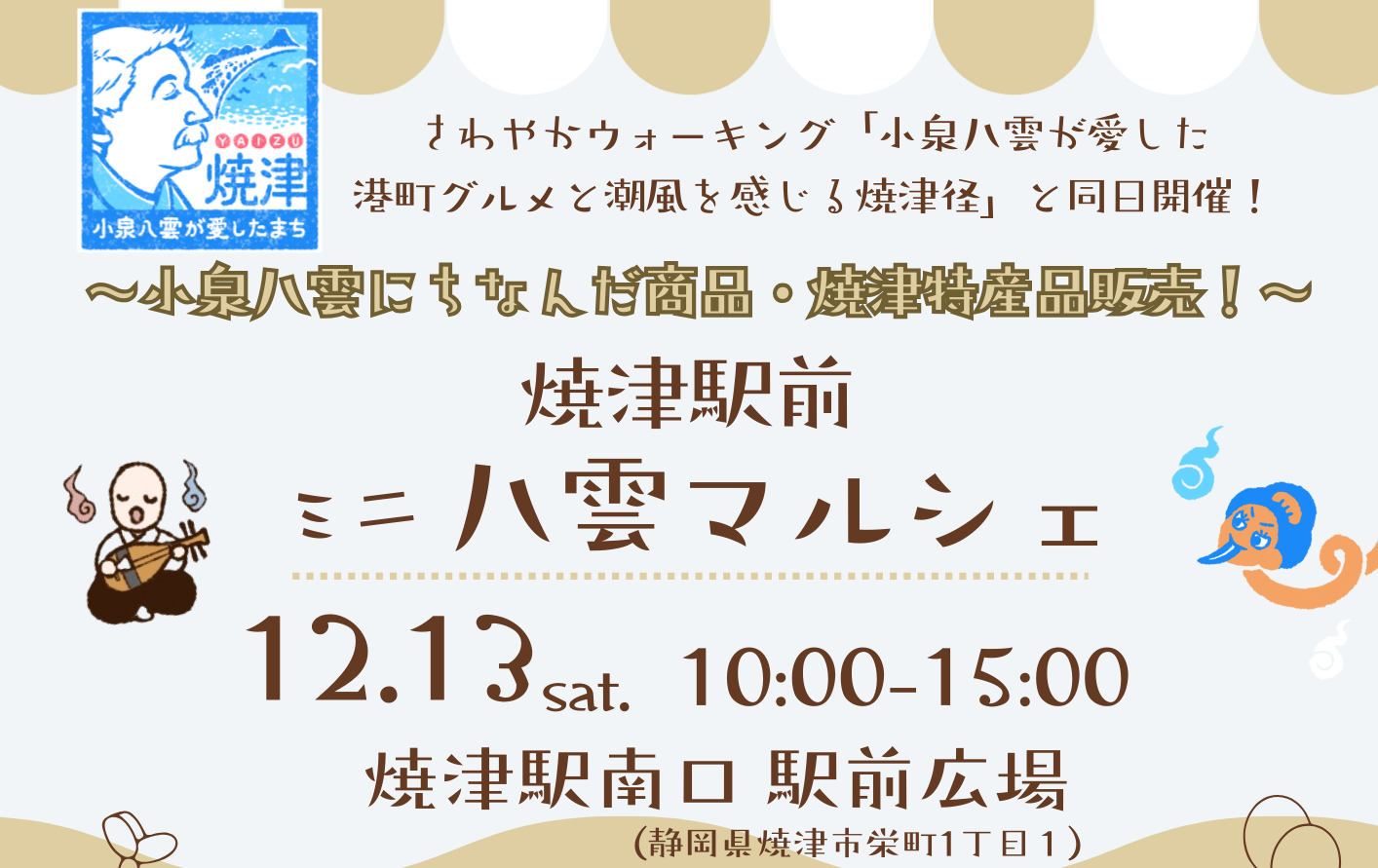 焼津市観光協会では、「焼津駅前 ミニ八雲ミニマルシェ」を開催し、ウォーキング参加者、市内外から訪れる皆様に、小泉八雲にちなんだ焼津のお土産、飲食物などを販売、PRいたします。