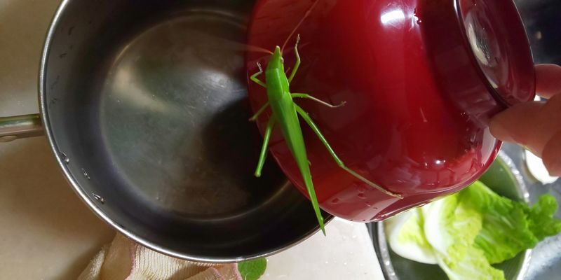 「白菜の葉の間に居て、一緒に冷蔵庫に入っていたのかしら?」、「外気温より、冷蔵庫の方が暖かいかも?」等と色々考えながら、結局はこの珍客を土のついた一番外側の白菜の葉に乗せ、外の庭に置きました。