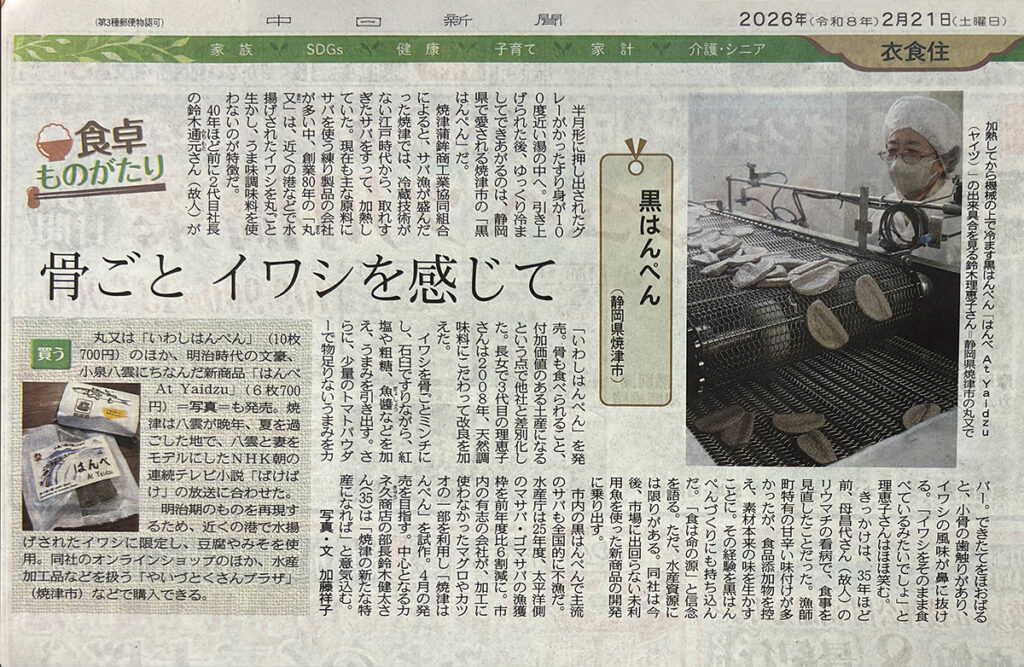 先日の2月21日(土)、中日新聞と東京新聞の紙面に弊社の黒はんぺんが紹介されました。